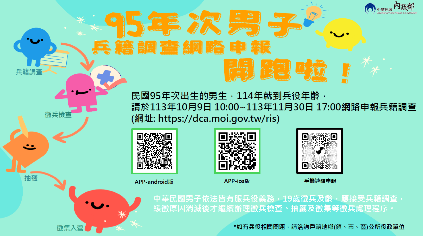 申報對象:凡95年次出生之役男,依兵役法第1條、第3條、第32條規定均應接受兵籍調查,出境國外、在學中或就讀軍、警學校者亦同。