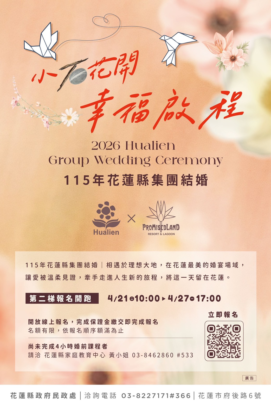 115年花蓮縣春季集團結婚報名再開放至4月27日下午5時。還沒報名的新人請把握機會!