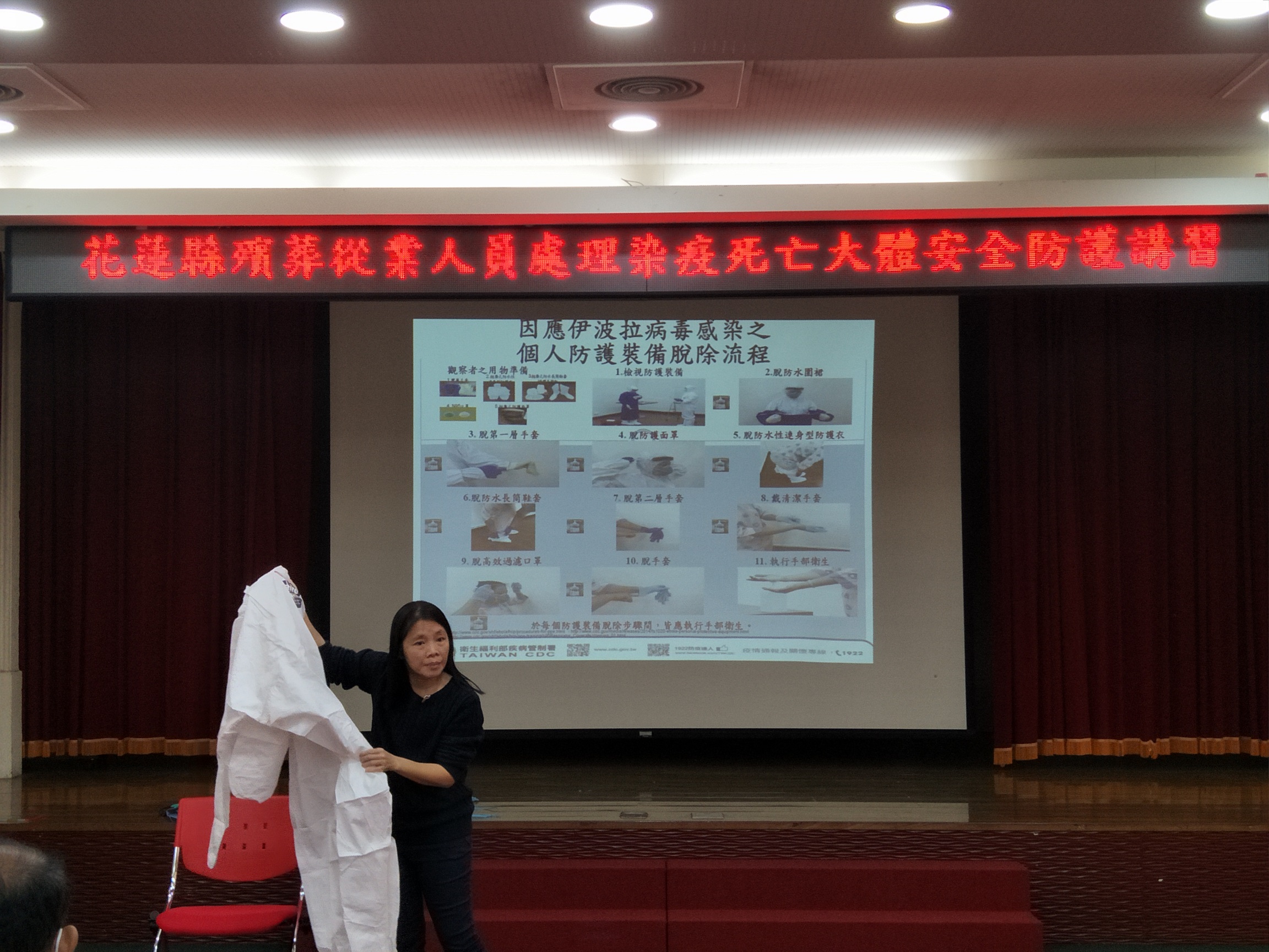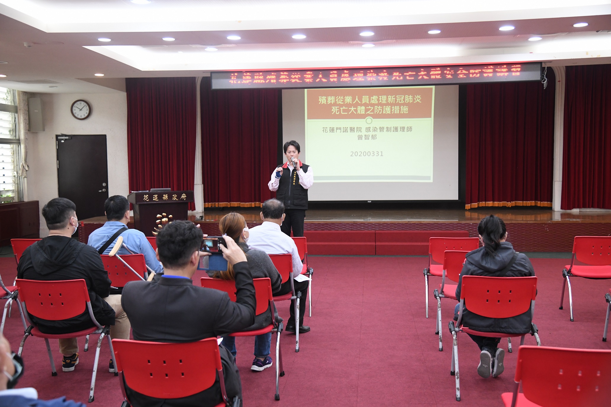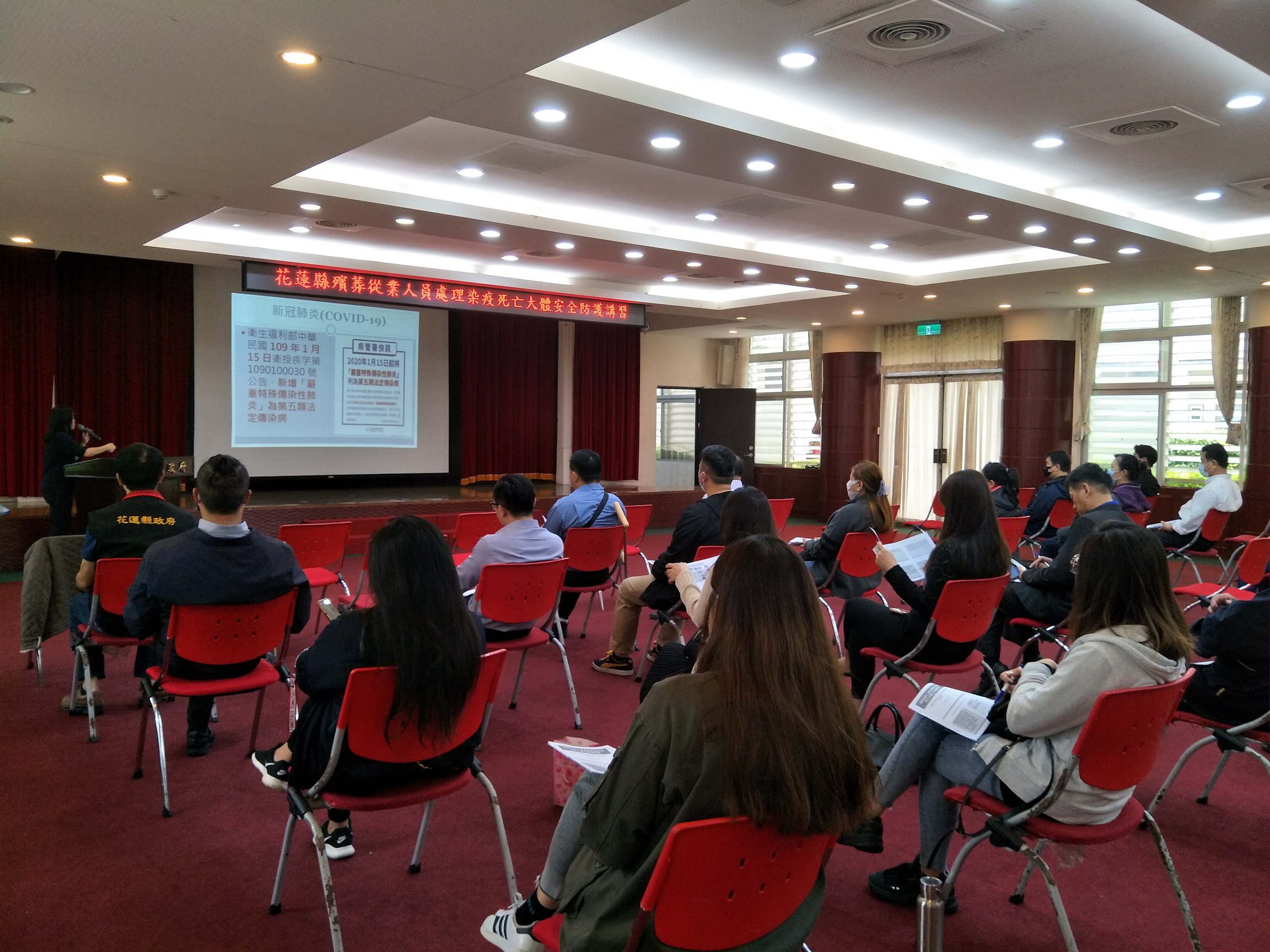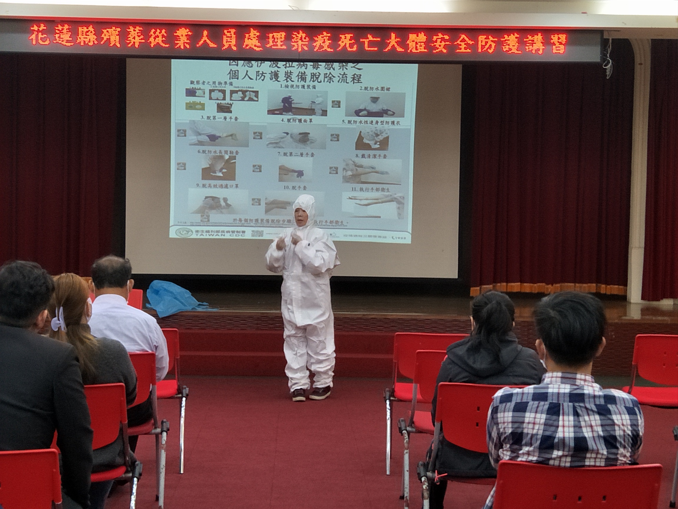 花蓮縣政府為確保本縣第一線殯葬工作相關人員處理染疫大體時的健康和安全,降低感染風險,3月31日在縣府大禮堂舉辦殯葬從業人員處理染疫死亡大體安全防護講習,邀請花蓮門諾醫院感染管制護理師曾智郁擔任講師,與會人員包含花蓮地方法院檢察署檢察人員、殯葬禮儀服務業者、各鄉鎮市公所殯儀館及火化場工作人員計51名。