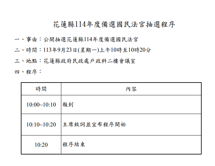 一、公告事項:為因應國民法官法公布施行,本府辦理公開隨機抽選「114年備選國民法官初選名冊」程序。