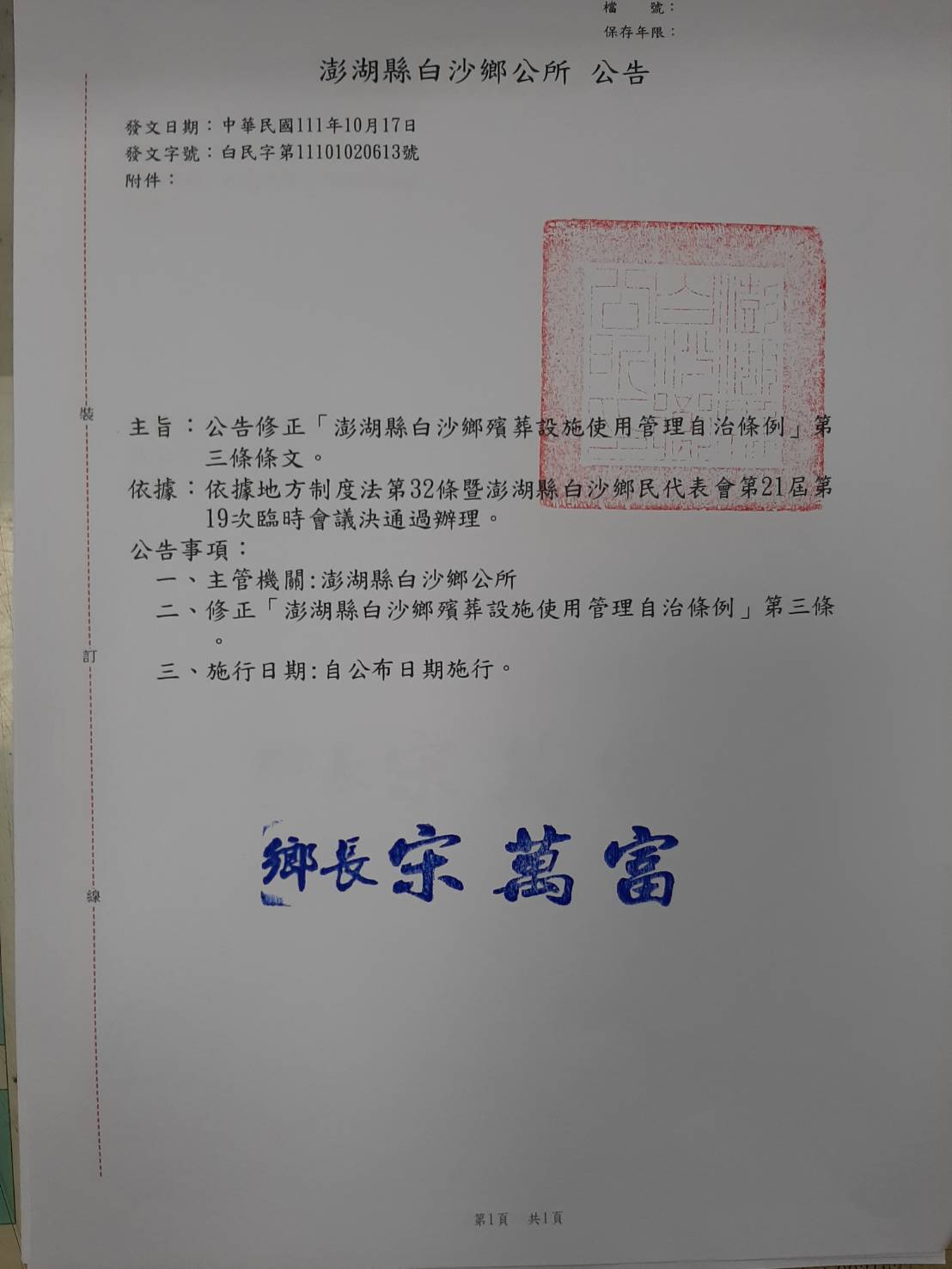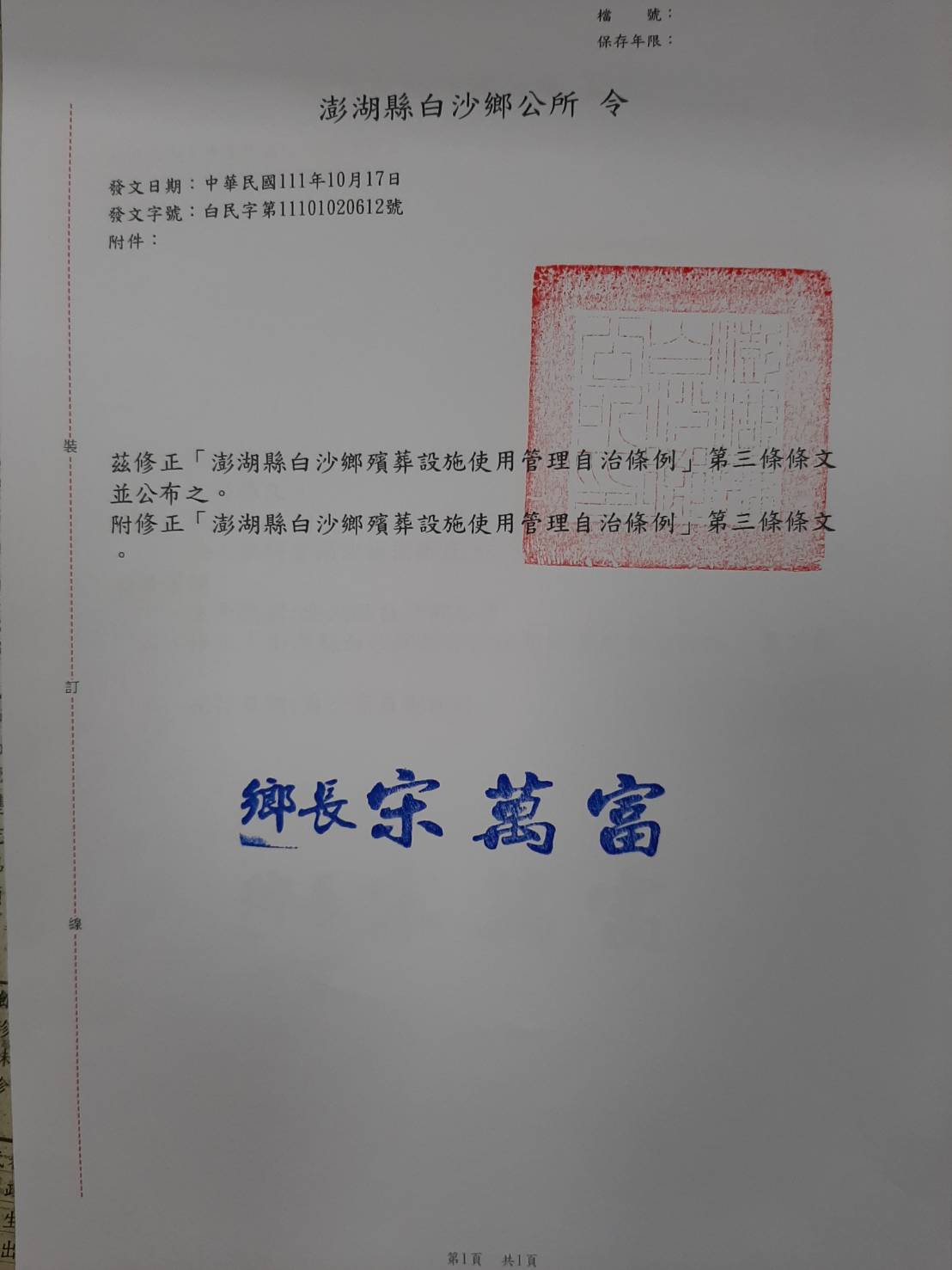 「澎湖縣白沙鄉殯葬設施使用管理自治條例」第三條修正公告 令.jpg