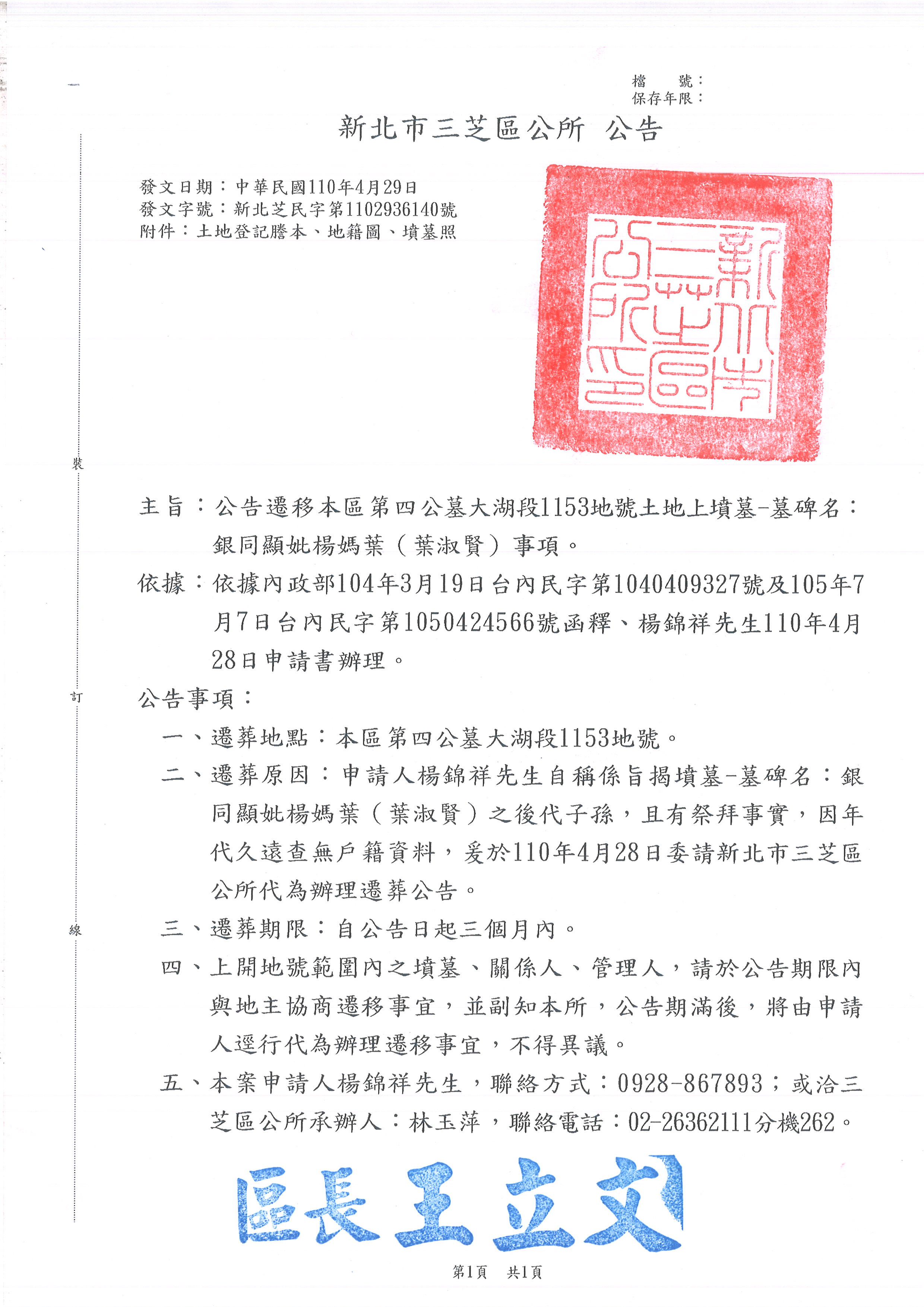 第四公墓大湖段1153地號土地上墳墓-墓碑名:銀同顯妣楊媽葉(葉淑賢)遷移公告 照片.pdf