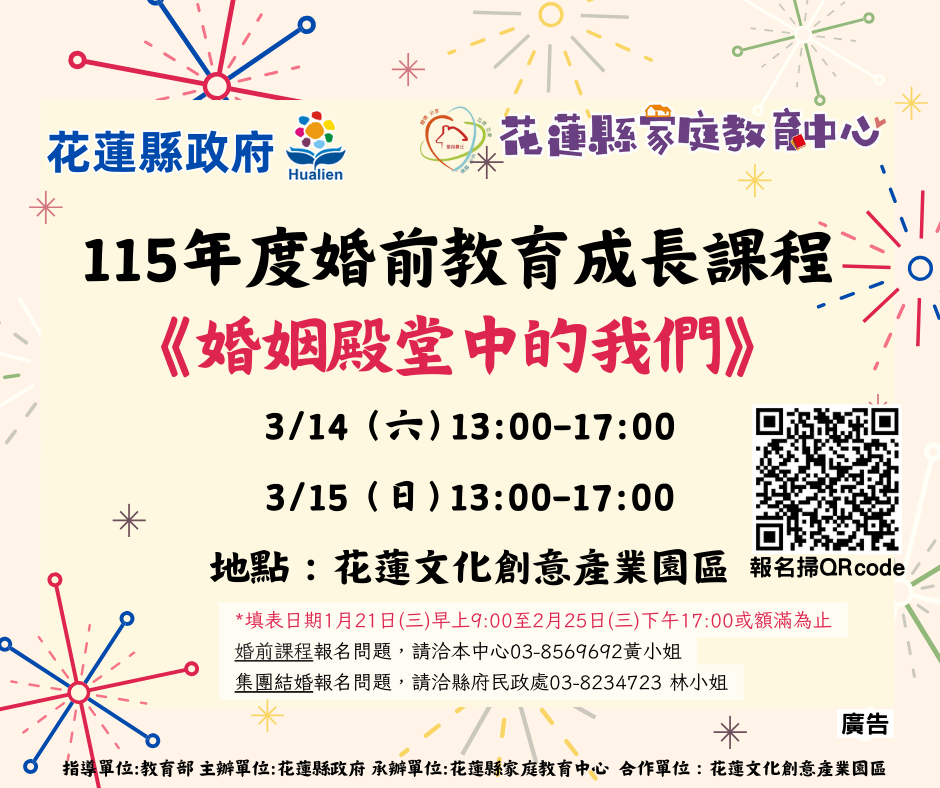 轉知"115年花蓮縣家庭教育中心婚前4小時課程1/21早上9點開放報名"