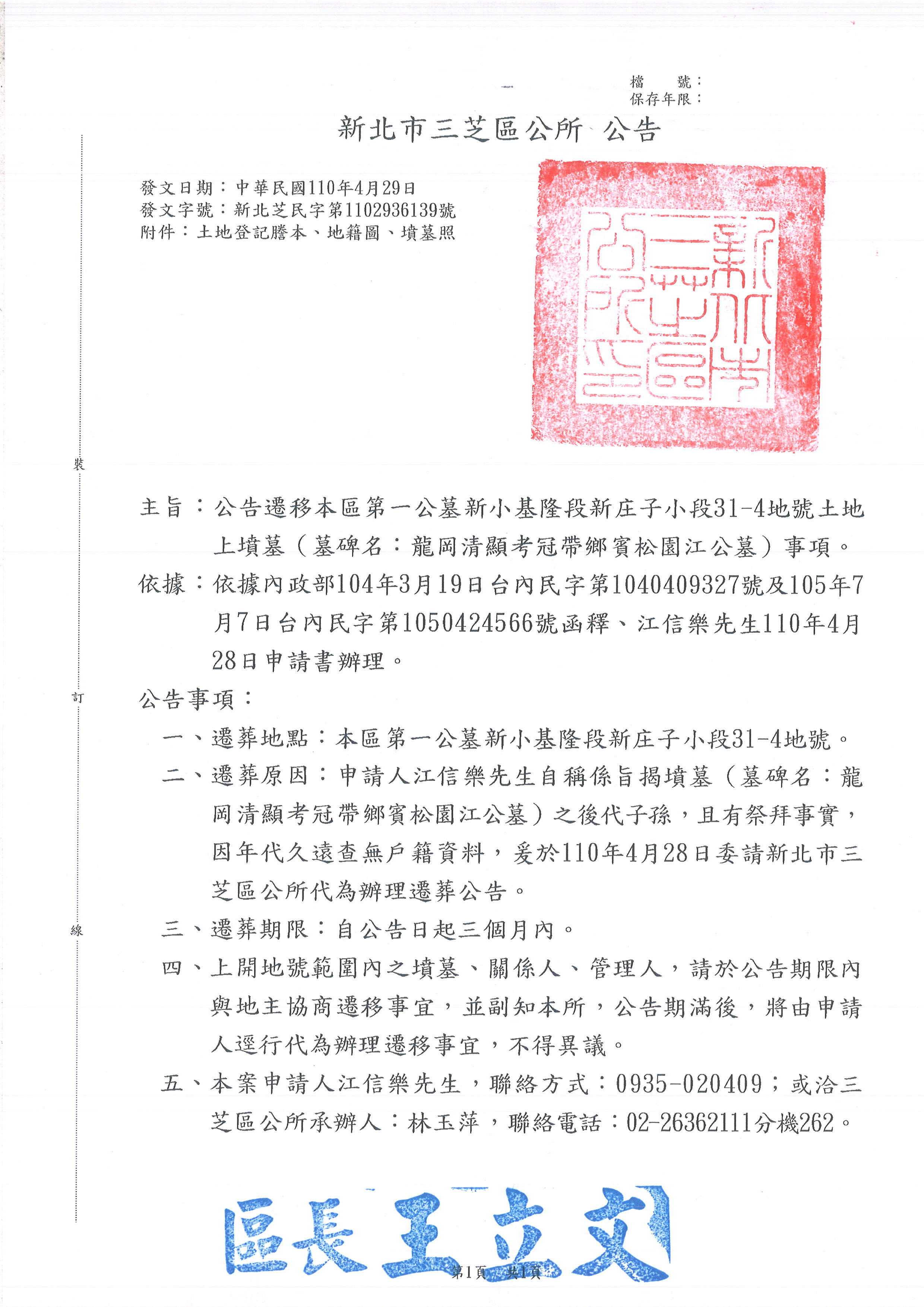 第一公墓新小基隆段新庄子小段31-4地號土地上墳墓(墓碑名:龍岡清顯考冠帶鄉賓松園江公墓)遷移公告 照片.pdf