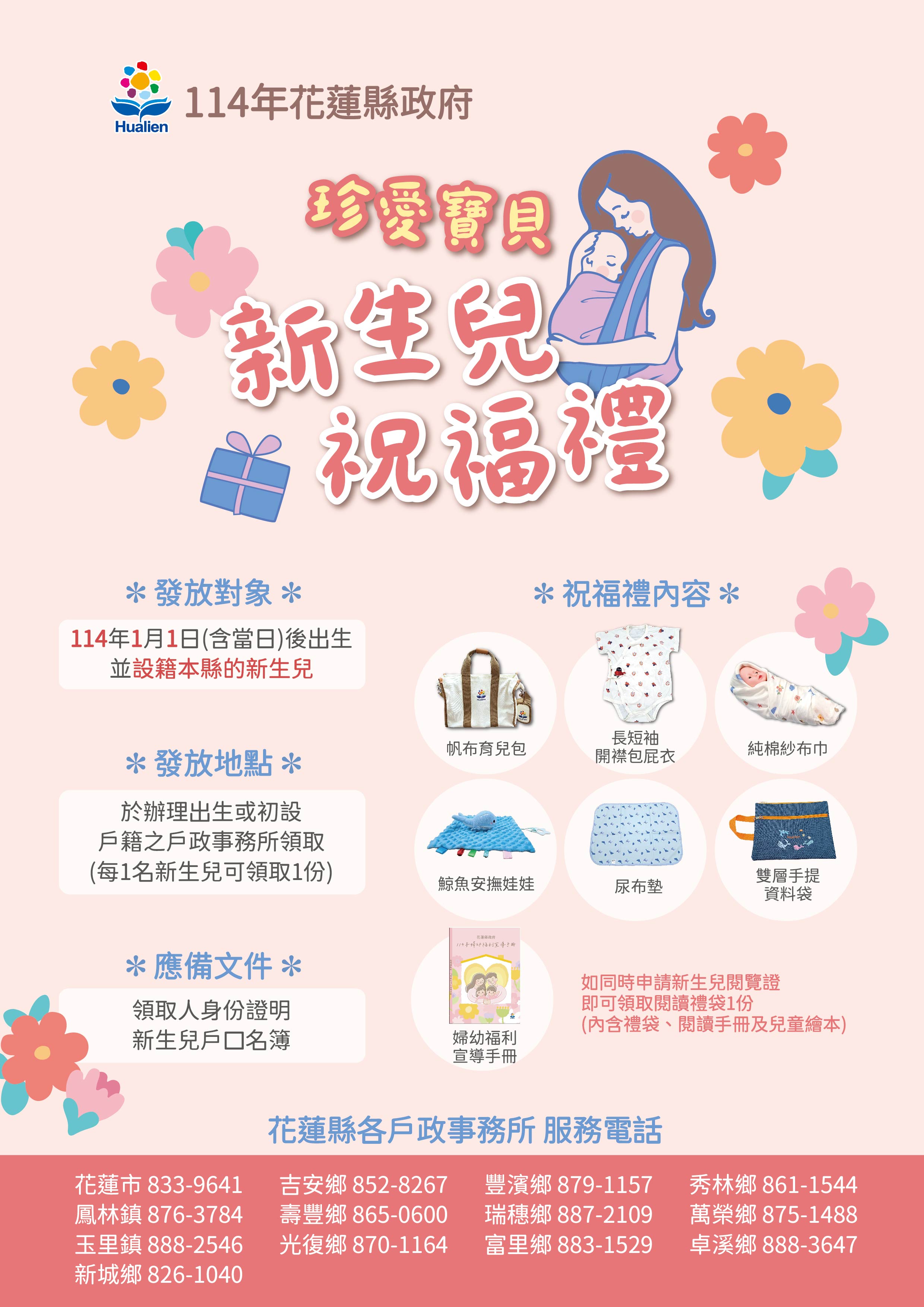 即日起,自114年1月1日(含當日)以後出生並設籍花蓮的新生兒,家長可於辦理新生兒出生或初設戶籍時領取「新生兒祝福禮」1份。民眾如有相關疑問,可逕洽本縣各戶政事務所或民政處戶政科(電話:03-8235475)。