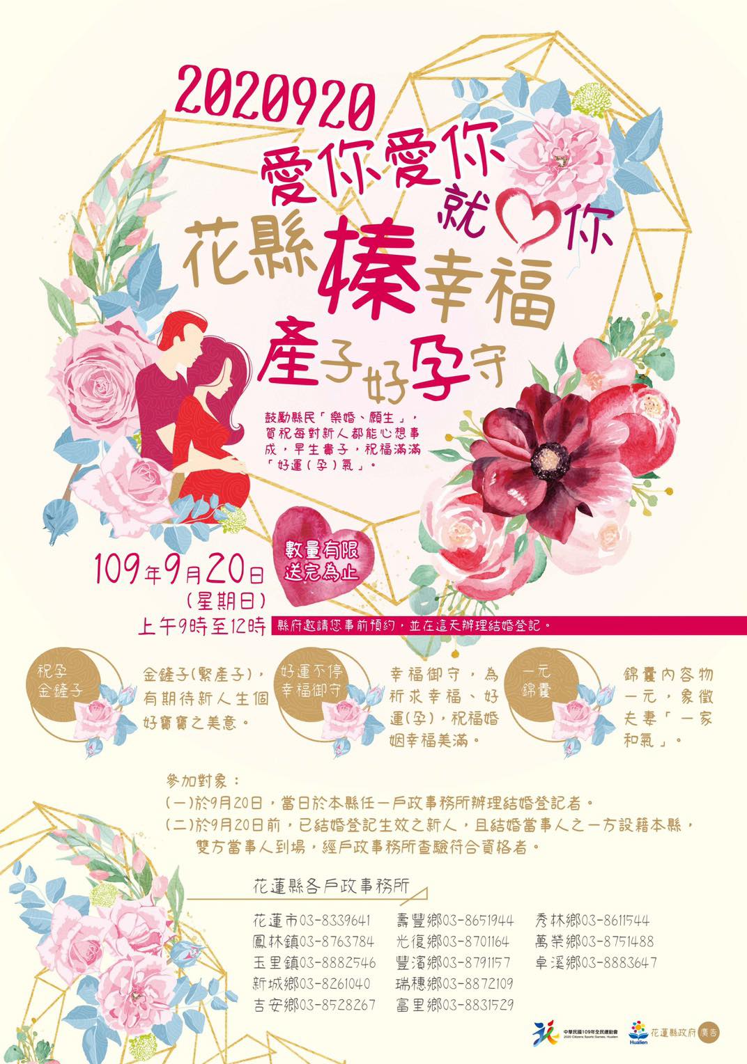 花蓮縣政府,鼓勵縣民「樂婚、願生」,祝賀每對新人都能心想事成,早生貴子,祝福滿滿好運(孕)氣,誠摯邀請新婚新人一起參加,一起來度過美好的就愛你920週日假期吧!