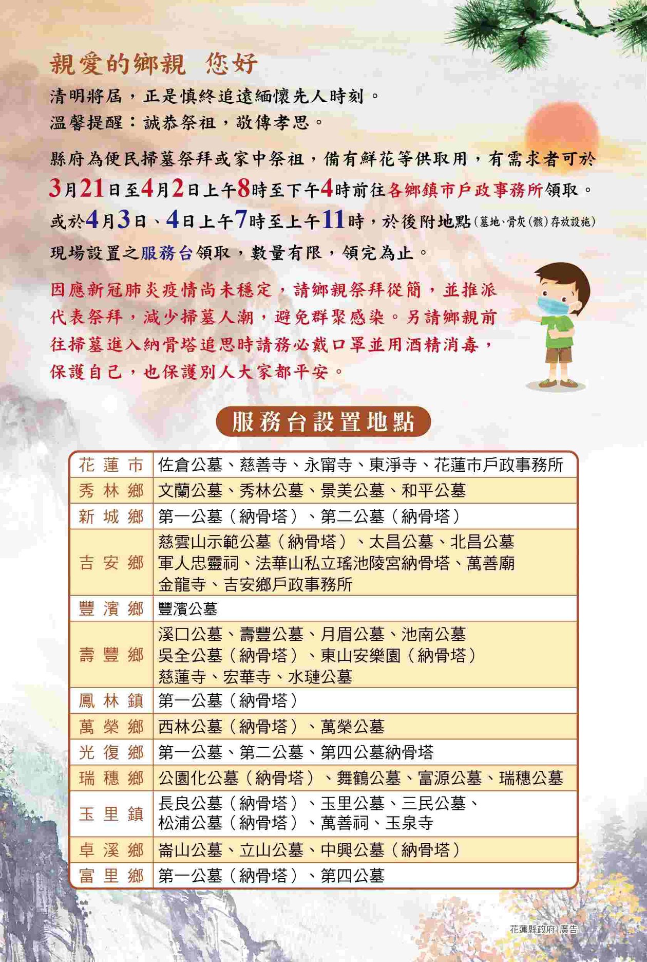 花蓮縣政府清明掃墓便民措施3月21日至4月2日開放民眾於十三鄉鎮市戶所領取鮮花;4月3日、4日於各鄉鎮市戶政事務所及各公墓、納骨塔等據點發放鮮花與礦泉水等掃墓祭祀用品,歡迎民眾踴躍領取。縣長徐榛蔚提醒民眾,因應新冠肺炎防疫措施,鼓勵分流掃墓或由少數家族代表清理墓園、祭祀,以降低群聚感染風險。倘需進入納骨塔追思,務必配戴口罩,以維安全健康。